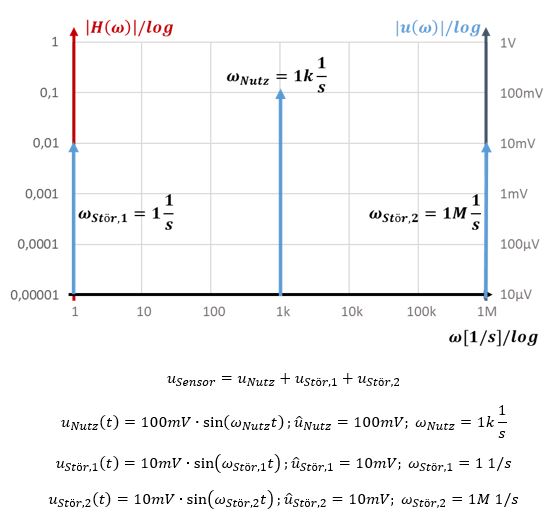 Beide Störsignale sollen möglichst stark vom Filter gedämpft werden. Rund um das Nutzsignal soll das Filter mit |H| = 1 das Signal unverändert passieren lassen. Je weiter wir die Filter-Grenzfrequenzen von den Störfrequenzen entfernen, desto besser dämpft das Filter die Störsignale.