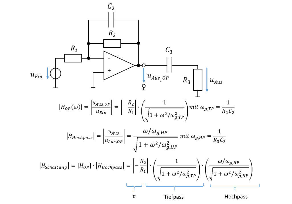 Das Hochpass-Filter wird durch die Bauelemente R1 und C1 bestimmt. Mit R2 und C2 wird die Tiefpass-Grenzfrequenz festgelegt. Mit dieser Schaltung werde ich eine Beispiel-Aufgabe rechnen: