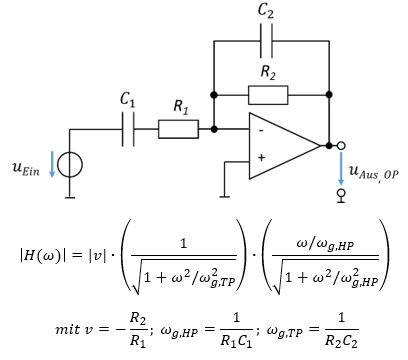 Ein Bandpass-Filter kombiniert Hochpass- und Tiefpass-Verhalten. Es verstärkt im Bereich um die Nutzfrequenz herum mit |H(ω)|=1. Das Bandpass-Filter weist zwei Grenzfrequenzen auf. Die untere Grenzfrequenz ist die Grenzfrequenz des Hochpasses, die obere die des Tiefpasses. Ein Bandpass-Filter wird eingesetzt, wenn Störungen mit hohen und tiefen Frequenzen im Nutzsignal enthalten sind.