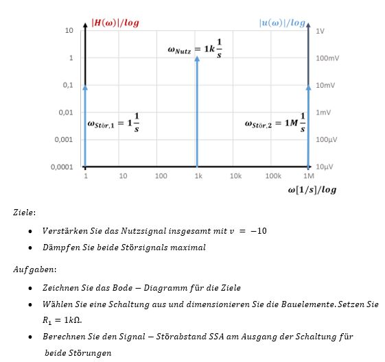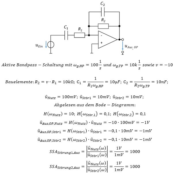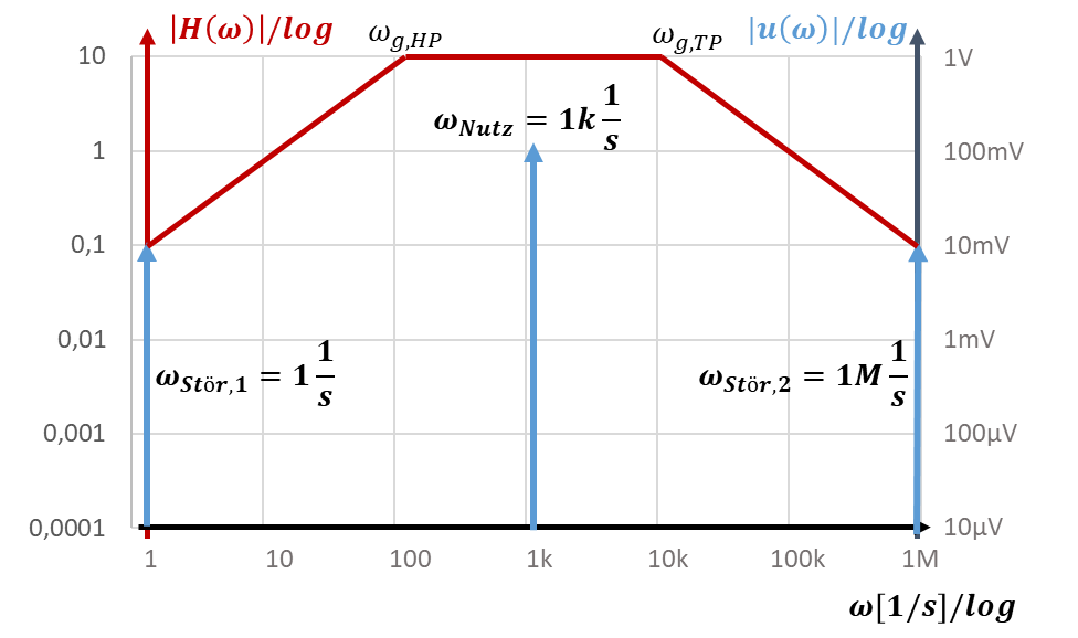 Das niederfrequente Störsignal uStör,1 wird vom Hochfpass-Filter um Faktor 100 gedämpft. Dieser Wert kann entweder mathematisch bestimmt werden oder aus dem Bode-Diagramm abgelesen werden. Das Signal passiert das Tiefpass-Filter unverändert, da seine Frequenz so niedrig ist, dass das Tiefpassfilter dort |H| = 1 aufweist. Insgesamt wird das Signal um Faktor -10 / 100 = -0,1 verstärkt.