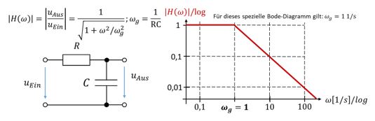 Ein passives Tiefpassfilter aus Widerstand und Kondensator weist folgende Struktur und Übertragungsfunktion auf: