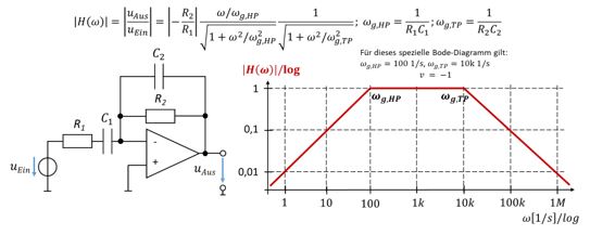 Ein Bandpass-Filter kombiniert Hochpass (HP) und Tiefpass (TP) Verhalten in einer Schaltung. Ein aktives Bandpass-Filter weist folgende Struktur und Übertragungsfunktion auf: